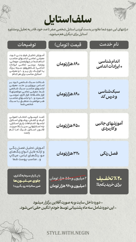 در این دوره، از صفر تا صد یاد میگیرید استایل خودتان را بسازید! از شناخت اندام و سبک شخصی گرفته تا انتخاب رنگهای درست برای لباسها و میکاپ و خرید هوشمندانه لباس!